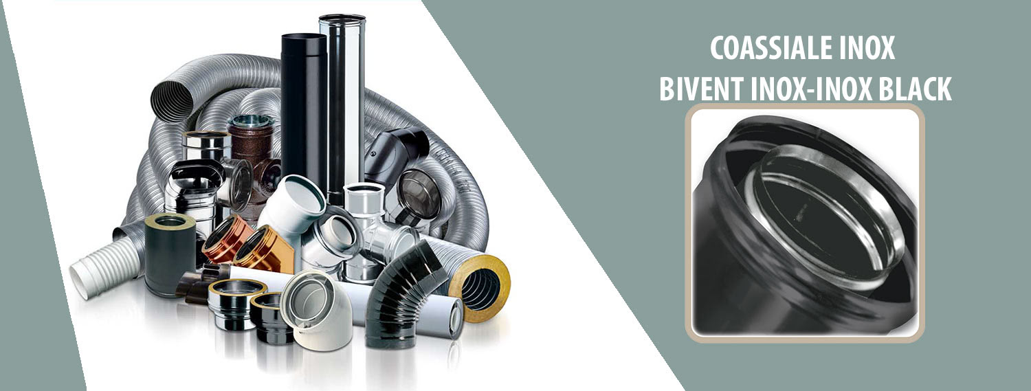 Il sistema coassiale inox-inox nero BIVENT INOX – INOX BLACK è composto da elementi componibili rigidi coassiali, realizzati in acciaio inox AISI 316L di spessore minimo 0,4 mm e protetti da una parete esterna in acciaio inox AISI 304, verniciato nero opaco spessore 0,4 mm, che forma il cavedio di contenimento per la ventilazione semplice e/o l’adduzione dell’aria comburente del generatore, conformi agli standard previsti dalla marcatura CE secondo la normativa EN 1856-1 ed EN 14989-2. Gli elementi modulari hanno innesto classico a bicchiere maschio-femmina calibrato con guarnizione di tenuta a triplice labbro, conforme alla normativa europea EN 14241.