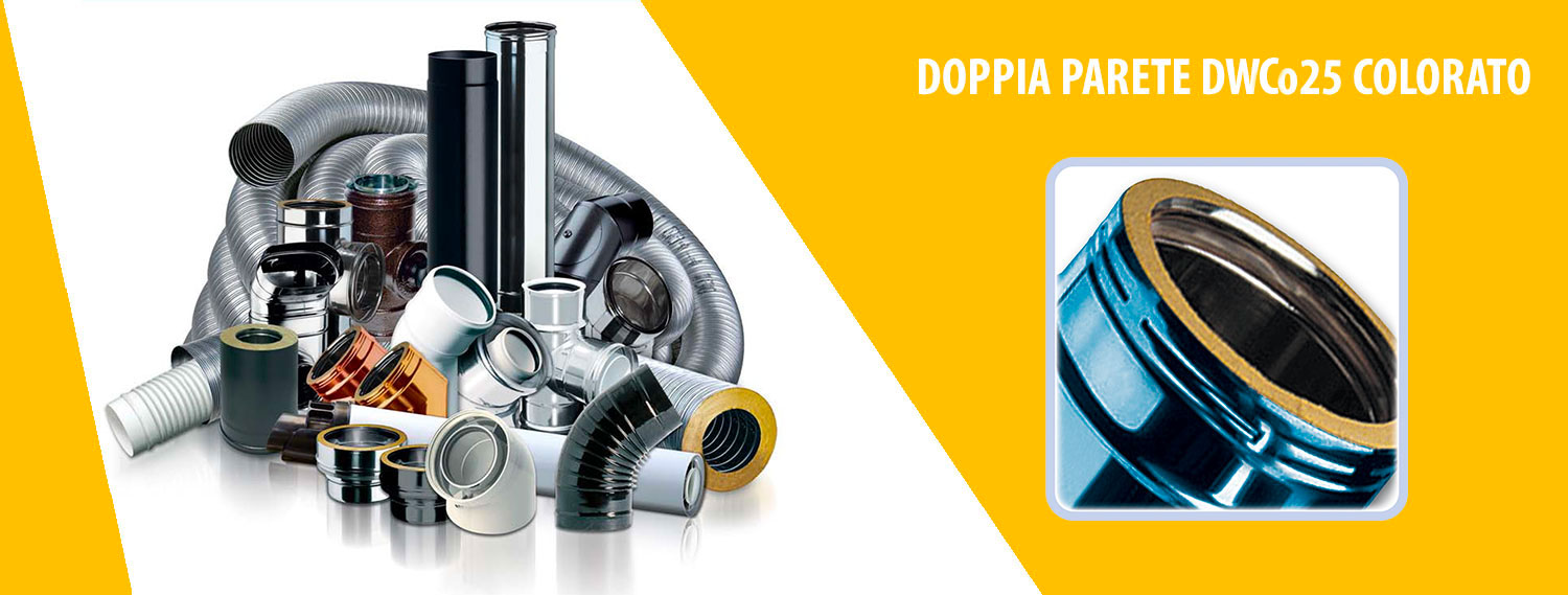 l sistema doppia parete DWC25 è composto da elementi componibili rigidi con finitura in acciaio colorao, realizzati con parete interna in acciaio inox AISI 316L di spessore minimo 0,4 mm e parete esterna in acciaio colorato di spessore 0,5 mm, conformi agli standard previsti dalla marcatura CE secondo la normativa EN 1856/1. La coibentazione è realizzata in lana minerale ad alta densità di spessore 25 mm, pressata ed interposta tra le pareti senza elementi di giunzione tra le stesse (ponte termico). Gli elementi modulari hanno innesto classico a bicchiere maschio-femmina calibrato per entrambi le pareti con guarnizione di tenuta a triplice labbro da inserire sulla parete interna, conforme alla normativa europea EN 14241-1, e giunzione meccanica con fascetta di sicurezza.