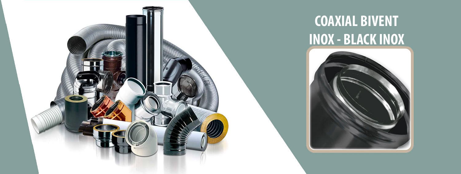 The BIVENT INOX – INOX BLACK coaxial stainless steel-black stainless steel system is made up of coaxial rigid modular components manufactured in AISI 316L stainless steel with a minimum thickness of 0.4 mm and protected by an external wall in AISI 304 stainless steel, painted matt black, thickness 0 .4 mm, which forms the containment for simple ventilation and/or the supply of combustion air to the generator, compliant with CE marking according to the EN 1856-1 and EN 14989-2 European standards. The modular components have a classic calibrated male-female socket coupling with triple lip seal, compliant with European standard EN 14241.