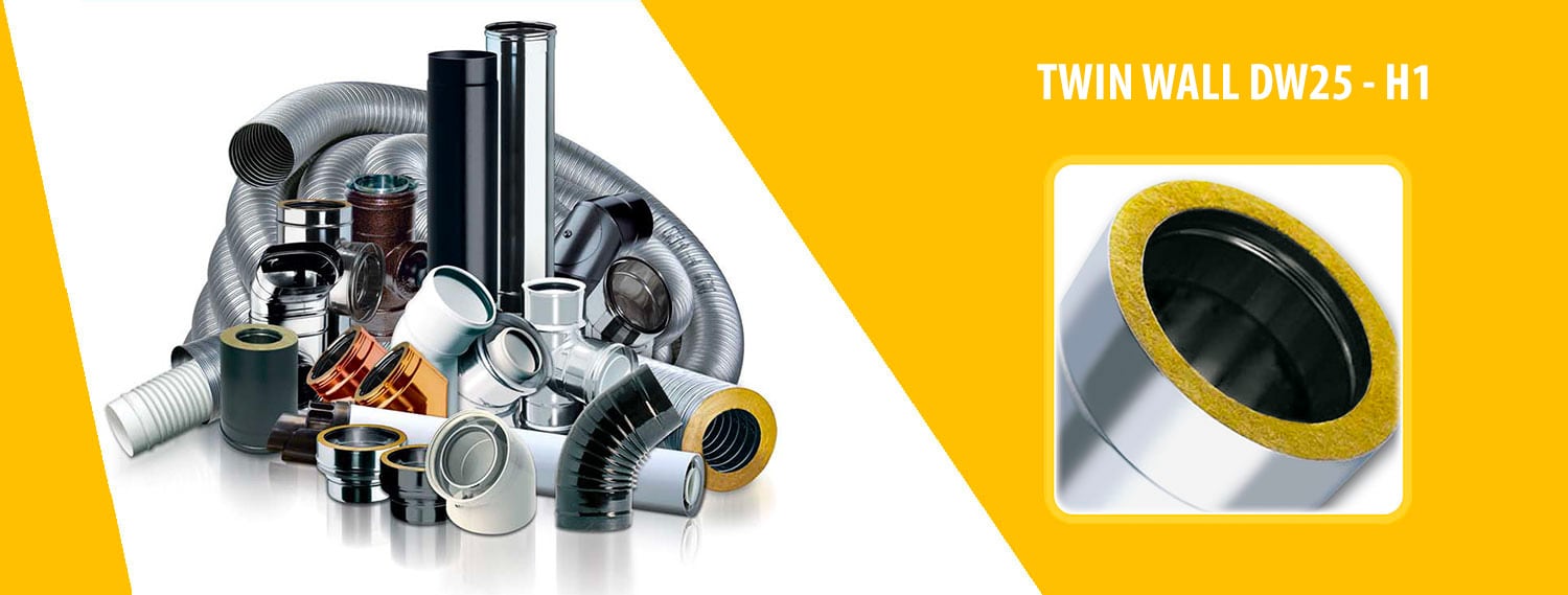 The DW – H1 twin wall flue system is made up of rigid modular components with an internal wall in AISI 316L stainless steel and an external wall in AISI 304 stainless steel with interposed high – density rockwool . The DW – H1 system does not require silicone sealing gaskets as it is equipped with a special male – female joint. The practical joint system guarantees perfect sealing against vibrations and high temperatures with high pressure. The DW – H1 system has a wide range of accessories that allow you to create different types of fireplaces: single flue, flues and chimneys.