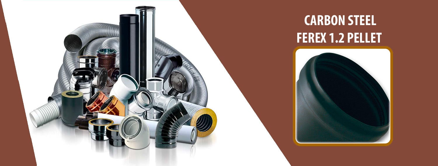 The FEREX 1.2 PELLET single-wall system is made up of rigid modular components, manufactured in matt black painted carbon steel with a minimum thickness of 1.2 mm, compliant with CE marking according to the EN 1856-2 European standards. The modular components have a classic male-female socket coupling calibrated with triple lip sealing gasket, to be used only with temperatures not exceeding 200 °C and positive pressures up to 200 Pa, and junction mechanics with simple coupling. All compliant with European standard EN 14241-1.